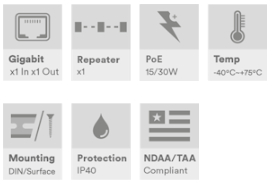 Standardmodell, industriell 1-kanals PoE Ethernet-repeater, 1 x 10/100/1000Base-T(x) RJ45-inngangsport, 1 x 10/100/1000Base-T(x) RJ45-utgangsport, 100 m avstandsforlengelse, støtter 802.3at 30 W PoE brukervalgbare gjennomgangs- eller PD-moduser, DIN-skinne-/veggmontering, -40 °C til +75 °C