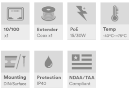 Industriell 1-ports Ethernet-forlenger over koaksialkabel, 1 x 10/100Base-T(x) RJ45-port, 1 x Extend-Net™ koaksial BNC-port, støtter 802.3at 30W PoE-gjennomgang, DIN-skinne-/veggmontering, -40°C til +75°C, 12–56VDC strøminngang