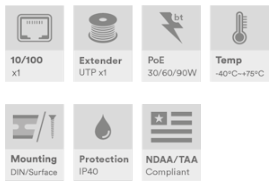 Industriell 1-ports Ethernet-forlenger over UTP, 1 x 10/100Base-T(x) RJ45-port, 1 x Extend-Net™ UTP RJ45-port, støtter 802.3at/bt 30/60/90W PoE-gjennomgang, DIN-skinne-/veggmontering, -40°C til +75°C, 12–56VDC strøminngang