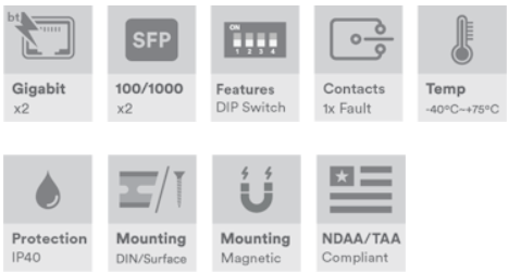 Tokanals 2+2 industriell PoE-mediekonverter / 4-porters ustyrt svitsj, 2 x 10/100/1000Base-T(x) RJ45-porter med 802.3bt 60/90W PoE, 2 x 100/1000Base-Fx SFP-porter, DIP-svitsjfunksjoner, DIN-skinne / veggmontering, -40°C til +75°C, 2 x 52–56VDC strøminnganger, feilrelé