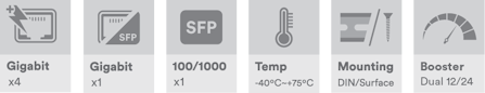Industriell 6-porters PoE-svitsj, 4 x 10/100/1000Base-T(x) RJ45-porter med 802.3at 30W PoE, 1 x 10/100/1000Base-T(x) RJ45- eller 100/1000Base-Fx SFP-kombinasjons port, 1 x 100/1000Base-Fx SFP-port, DIN-skinne-/veggmontering, -40°C til +75°C, 12–48VDC strøm inngang med spennings forsterker