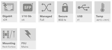 Industriell 28-porters administrert svitsj, 24 x 10/100/1000Base-T(x) RJ45-porter med 802.3at 30W PoE (300W maks), 4 x 1/2.5/10G Base-FX SFP+-porter, 1U 19-tommers rackmontering, -40°C til +75°C, 100–240VAC IEC-nettstrøminngang