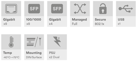 Industriell 20-porters administrert svitsj, 8 x 10/100/1000Base-T(x) RJ45-porter, 8 x 100/1000Base-Fx SFP-porter, 4 x 1000Base-Fx SFP-porter, DIN-skinnemontering, -40 til +75 °C, 12–56 VDC strøminngang