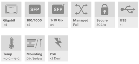 Industriell 20-porters administrert svitsj, 8 x 10/100/1000Base-T(x) RJ45-porter, 8 x 100/1000Base-Fx SFP-porter, 4 x 1/2,5/10G Base-Fx SFP+-porter, DIN-skinnemontering, -40 til +75 °C, 12–56 VDC strøminngang