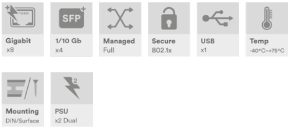 Industriell 12-porters administrert svitsj, 8 x 10/100/1000Base-T(x) RJ45-porter med 802.3at 30W PoE, 4 x 1/2.5/10G Base-Fx SFP+-porter, DIN-skinnemontering, -40 til +75 °C, 48–56 VDC strøminngang