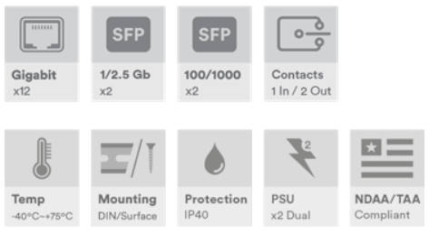 Industriell 16-porters administrert svitsj, 12 x 10/100/1000Base-T(x) RJ45-porter, 2 x 100/1000Base-FX SFP-porter, 2 x 100/1000/2,5G Base-FX SFP-porter, DIN-skinne/veggmontering, -40°C til +75°C, 12–56 VDC strøminngang