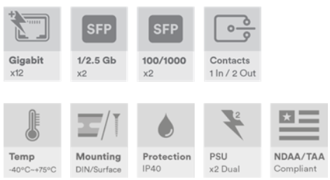Industriell 16-porters administrert svitsj, 12 x 10/100/1000Base-T(x) RJ45-porter med 802.3at 30W PoE, 2 x 100/1000Base-FX SFP-porter, 2 x 100/1000/2.5G Base-FX SFP-porter, DIN-skinne/veggmontering, -40°C til +75°C, 50–56VDC strøminngang
