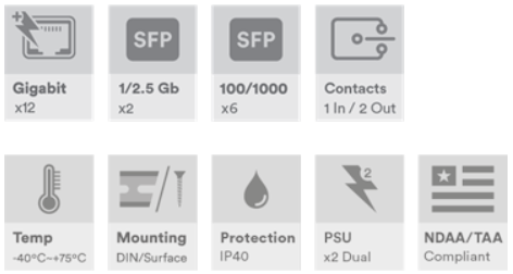 Industriell 20-porters administrert svitsj, 12 x 10/100/1000Base-T(x) RJ45-porter med 802.3at 30W PoE, 6 x 100/1000Base-FX SFP-porter, 2 x 100/1000/2.5G Base-FX SFP-porter, DIN-skinne/veggmontering, -40°C til +75°C, 50–56VDC strøminngang