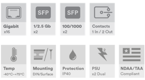 Industriell 20-porters administrert svitsj, 16 x 10/100/1000Base-T(x) RJ45-porter, 2 x 100/1000Base-FX SFP-porter, 2 x 100/1000/2,5G Base-FX SFP-porter, DIN-skinne/veggmontering, -40°C til +75°C, 12–56 VDC strøminngang