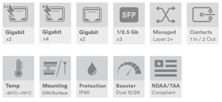 Industriell 11-porters administrert svitsj, 2 x 10/100/1000Base-T(x) RJ45-porter med 802.3bt 60/90W PoE, 4 x 10/100/1000Base-T(x) RJ45-porter med 802.3at 30W PoE (maks. 290W), 2 x 10/100/1000Base-T(x) RJ45-porter, 3 x 100/1000/2.5G Base-FX SFP-porter, DIN-skinne/veggmontering, -40°C til +75°C, 9–36VDC strøminngang med isolert spenningsforsterker