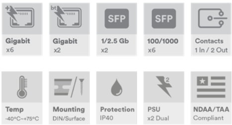 Industriell 16-porters administrert svitsj, 2 x 10/100/1000Base-T(x) RJ45-porter med 802.3bt 60/90W PoE, 6 x 10/100/1000Base-T(x) RJ45-porter med 802.3at 30W PoE, 6 x 100/1000Base-FX SFP-porter, 2 x 100/1000/2.5G Base-FX SFP-porter, DIN-skinne/veggmontering, -40°C til +75°C, 52–56VDC strøminngang