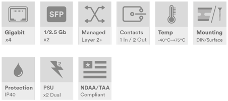 Industriell 6-porters administrert svitsj, 4 x 10/100/1000Base-T(x) RJ45-porter, 2 x 100/1000/2.5G Base-FX SFP-porter, DIN-skinne/veggmontering, -40°C til +75°C, 12–56 VDC strøminngang.