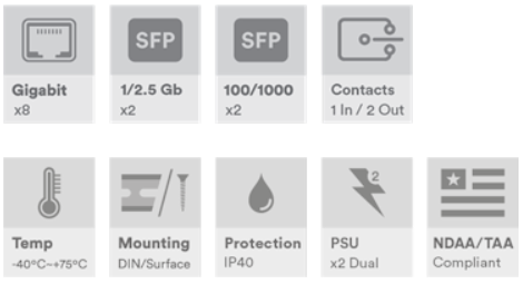 Industriell 12-porters administrert svitsj, 8 x 10/100/1000Base-T(x) RJ45-porter, 2 x 100/1000Base-FX SFP-porter, 2 x 100/1000/2,5G Base-FX SFP-porter, DIN-skinne/veggmontering, -40°C til +75°C, 12–56 VDC strøminngang