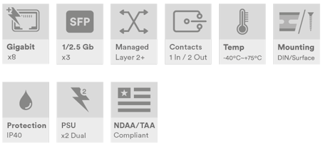 Industriell 11-porters administrert svitsj, 8 x 10/100/1000Base-T(x) RJ45-porter med 802.3at 30W PoE, 3 x 100/1000/2.5G Base-FX SFP-porter, DIN-skinne/veggmontering, -40°C til +75°C, 50–56VDC strøminngang