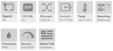 Industriell 11-porters administrert svitsj, 8 x 10/100/1000Base-T(x) RJ45-porter med 802.3at 30W PoE (maks. 90W), 3 x 100/1000/2.5G Base-FX SFP-porter, DIN-skinne/veggmontering, -40°C til +75°C, 9–36VDC strøminngang med isolert spenningsforsterker