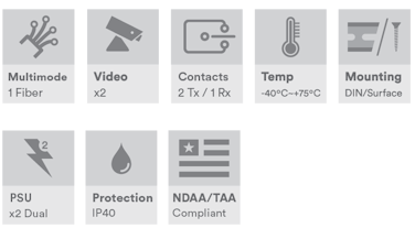 Dobbel industriell 2-kanals CVI/TVI/AHD/CVBS videomottaker, 2 x kontaktlukking i videoretning, 1 x kontaktlukking i returretning, multimodus 500 m, 1 fiber per kanal, 1550 nm, B-side, ST-kontakter, DIN-skinne/veggmontering, -40 °C til +75 °C, 9–36 VDC eller 24 VAC strøminngang