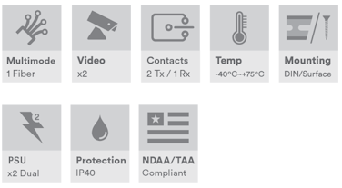 Industriell 2-kanals CVI/TVI/AHD/CVBS videomottaker, 2 x kontaktlukking i videoretning, 1 x kontaktlukking i returretning, multimodus 500 m, 1 fiber, 1550 nm, B-side, ST-kontakt, DIN-skinne/veggmontering, -40 °C til +75 °C, 9–36 VDC eller 24 VAC strøminngang