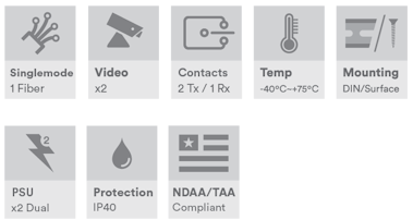 Industriell 2-kanals CVI/TVI/AHD/CVBS videomottaker, 2 x kontaktlukking i videoretning, 1 x kontaktlukking i returretning, enkeltmodus 20 km, 1 fiber, 1550 nm, B-side, ST-kontakt, DIN-skinne/veggmontering, -40 °C til +75 °C, 9–36 VDC eller 24 VAC strøminngang