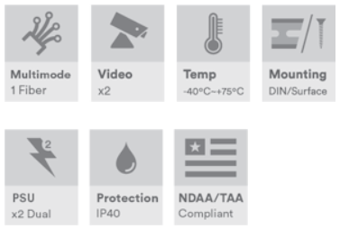Industriell 2-kanals CVI/TVI/AHD/CVBS videomottaker, multimodus 500 m, 1 fiber, B-side, ST-kontakt, DIN-skinne/veggmontering, -40 °C til +75 °C, 9–36 VDC eller 24 VAC strøminngang