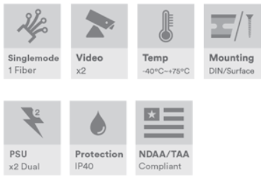 Industriell 2-kanals CVI/TVI/AHD/CVBS videomottaker, singelmodus 20 km, 1 fiber, B-side, ST-kontakt, DIN-skinne/veggmontering, -40 °C til +75 °C, 9–36 VDC eller 24 VAC strøminngang