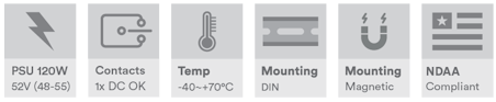 52 VDC, 120 W (2,3 A) industriell strømforsyning, DIN-skinne montering, -40 °C til +70 °C, feilreléutgang (justerbar 48–55 VDC)