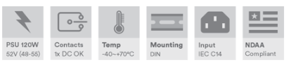 52 VDC, 240 W (4,6 A) industriell strømforsyning, DIN-skinnemontering, -40 °C til +70 °C, feilreléutgang (justerbar 48–55 VDC), IEC-nettstrøminngang, inkluderer EU-, USA- eller UK-strømledning med venstre vinkel, IEC-låsebrakett, 400 mm (16 tommer) likestrømskabel og 125 mm (5 tommer) DIN-skinne for montering av strømforsyning og utstyr.