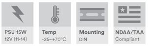 12 VDC, 15 W (1,2 A) industriell strømforsyning, DIN-skinnemontering, -25 °C til +70 °C, (Justerbar 11–14 VDC), NDAA- og TAA-kompatibel, laget i EU