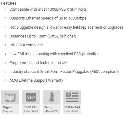 Produsentens hjemmeside: https://www.amgsystems.com/english/products/accessories/sfp-module/sfp-1g-series/sfp-cu-1g