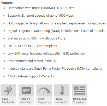 Produsentens hjemmeside: https://www.amgsystems.com/english/products/accessories/sfp-module/sfp-1g-series/sfp-mm-1g-sx05-85