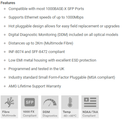 Produsentens hjemmeside: https://www.amgsystems.com/english/products/accessories/sfp-module/sfp-1g-series/sfp-mm-1g-sx2-31