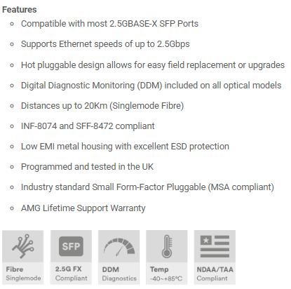 Produsentens hjemmeside: https://www.amgsystems.com/english/products/accessories/sfp-module/sfp-2-5g-series/sfp-sm-2-5g-bx20-31