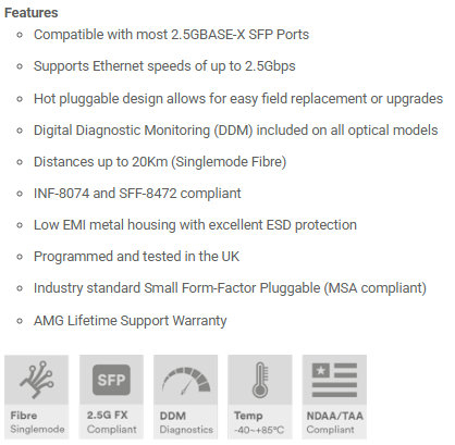 Produsentens hjemmeside: https://www.amgsystems.com/english/products/accessories/sfp-module/sfp-2-5g-series/sfp-sm-2-5g-bx20-55