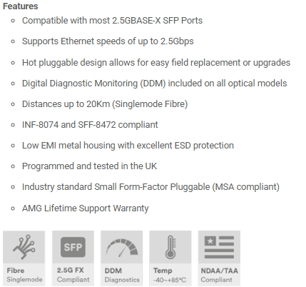Produsentens hjemmeside: https://www.amgsystems.com/english/products/accessories/sfp-module/sfp-2-5g-series/sfp-sm-2-5g-lx20-31